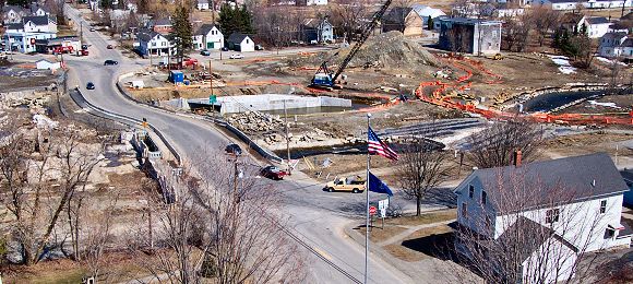 This view looking east from the bell tower of the Stewart Library Building shows much of the cleanup area in Corinna. Main Street, with its new curve, runs along the left. The new bridge structure is to the right of the street, near the crane. Presently the river runs under the old bridge and along just behind the American flag in the picture. The riverbed and the roadway will be moved into alignment with the new bridge later this year. Click here to see a view of Main Street before the mill demolition. Here is an aerial view of the same area before the Odd Fellows Hall was moved. |