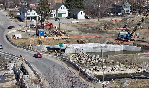 Here's a closer view of the new bridge sitting beside the old Main Street. This summer's remediation activities will change this view dramatically. |