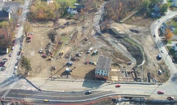 Let's continue our look back with this photo of a dramatic moment on Main Street in Corinna, October 10, 2000. This aerial was taken shortly after the second moving of the Odd Fellows Hall began. The cribwork to the right of the building is the foundation across the river where the building sat for over 50 years. |