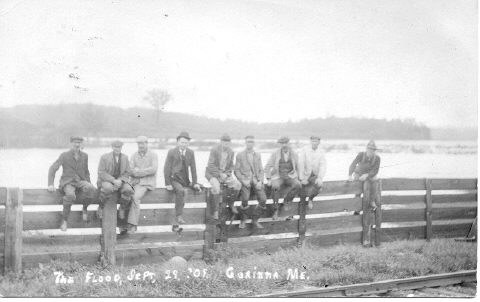 Peter Smith sent in this old post card photo in response to the Moosehead Mill flood picture posted a few days ago. The writing says, "The Flood, Sept, 29, '09 Corinna Me." I think this fence was located on the east side of the mill pond, along the railroad tracks. The Upper Dam is behind them in the direction of the the large tree left of center in the background. It looks like a earth dike runs to the right in the distance. See Bill Parkers Guest Book entry for some historical information about hurricanes. |