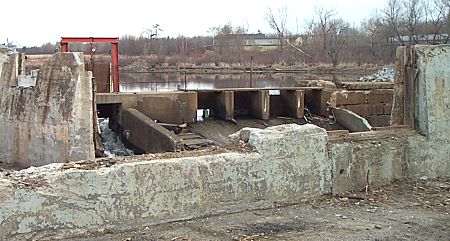 This picture was taken from Main Street on Saturday, April 15, 2000 at about 7:30 AM. With the work done this week, the entire "middle dam" is now visible. There is water running through the flood gate on the left. Get a look at it now. This dam will be removed as part of the river relocation. |