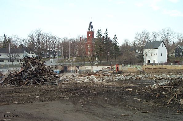 Click on this picture to view a larger copy. There are no buildings on the north side of Main Street. It has probably been almost 200 years since the view was unobstructed from the east end of the street back to West Main Street (the Palmyra Road) going out over the hill. When the town was incorporated in 1816 Moore's Mill was already grinding grain and sawing lumber on this location beside the river. |