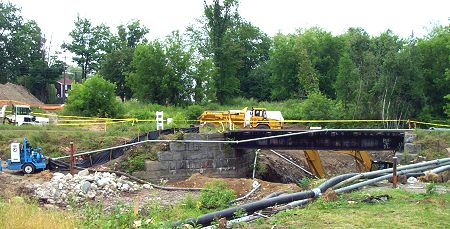 An extensive system of pipes and pumps are used to move water around the work site. The river flow is pumped around the excavation in the large black pipe seen here. The metal pipes collect contaminated water from the excavation holes and the truck washing stations. That water is treated. The contamination is removed before it is released back into the river. The contamination is not being allow to flow down stream. Samples of the water are taken regularly downstream to be sure the cleanup is not harming the river or Sebasticook Lake in Newport. They have found that the soil contamination in Areas 2 and 3 is connected. The two areas join in one large area that must be excavated. As a result, the railroad trestle must be removed. Some of us are hoping that the granite in the trestle foundation can be re-used somewhere in the site. However, we must remember, the granite is the property of the land owner, Guilford Transportation. |