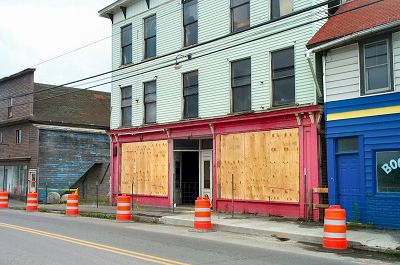 Yesterday workers used plywood to cover the storefront windows on the Odd Fellows Hall. They were also working on the inside of the building, preparing it to be moved. |
