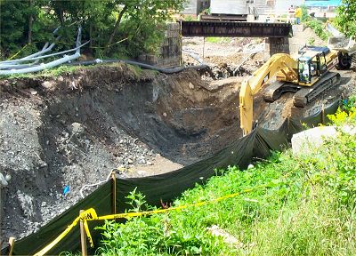This is Area 3, just below the railroad trestle. They are still removing soil. This backhoe works to keep three dump trucks making the trip from here to the soil stockpile area many times each day. |