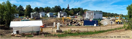 Click on this picture to view a larger copy. I've been experimenting with panoramas, taking a set of pictures and knitting them together with a graphics program. The picture above is my first completed attempt. It's actually a combination of four photos. They were taken from behind Lot 18A, the area where the Odd Fellows Hall will be placed on the Stetson Road. It will be interesting to it again after the rest of the buildings are gone. |