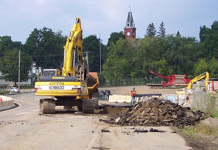 Within hours of opening the new section of road, digging began in the old Main Street. A new river channel will be excavated. Until the contamination is removed from this area, the river will flow in large pipes across to the new bridge. |