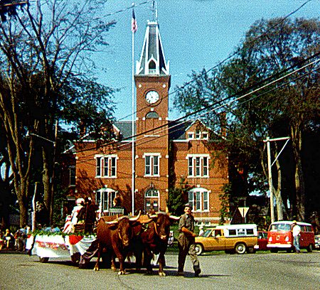 Danny Doherty found this picture of the Stewart Library Building taken in 1976, only 25 years ago during the parade for America's Bicentennial. Anyone recognize the man guiding the pair of oxen? |
