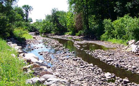 This is the riverbed just downstream from where the railroad trestle used to be (Typical Maine Directions- "Turn left where the Lester Farm used to be."). It was rebuilt last summer after the area was excavated. It looks pretty nice, even though there's not much water flowing these days. However, the micro-channel down the middle provides habitat for aquatic life during low water flow. |