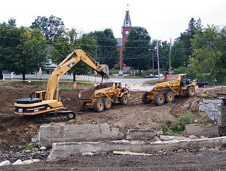 This picture was taken from the new road, just south of the bridge. There are four excavators and four of these trucks working in the excavation of the downtown area. |