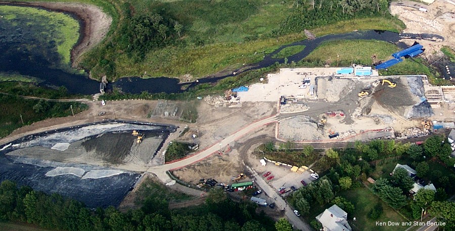 Click on this picture to view a larger copy. Here's a good aerial of the dirt works. On the left is the new contaminated soil stockpile area, recently constructed near the Upper Dam. To the right is the mill slab, and the original stockpile. Notice the road connecting these areas. After removing the rocks from the contaminated soil on the slab they are moving it to the new area. This screened soil will be treated next summer to remove the contamination. The rocks are washed to remove any contamination. The wash water is collected and sent to the on-site water treatment facility. |