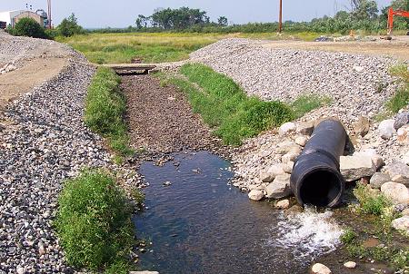 Looking north from the Route 7 bridge, this is the new riverbed just above the bridge. The water was re-routed through the pipe so a small bridge could be built allowing dump trucks to cross. The trucks moved the pile of crushed rock to the other side, dumping it in the excavation hole. |