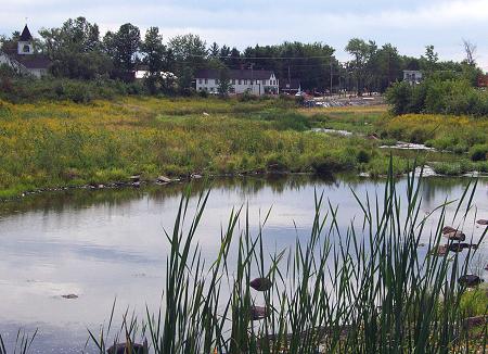 This is the view from the Upper Dam (Corundel Dam) looking downstream. This area used to be the mill pond. The stream path was re-shaped slightly. The open land, formerly under water, has been allowed to grow back as a fertile flood plain. In the distance we can see the Methodist Church, The Hemingway Building (Pearson's Store) and the top corner of the Odd Fellows Hall. |