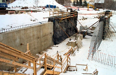 One section the bridge abutment emerged this week as the forms were removed from the reinforced concrete. I'm told that, including the wing extensions on either end, the abutments are about 100 feet long. |