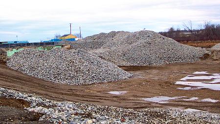 These two piles of crushed rock are at the back of the Area 1 excavation. Tons of it were produced as the rocks from the excavated soil were washed to remove contamination and crushed. |