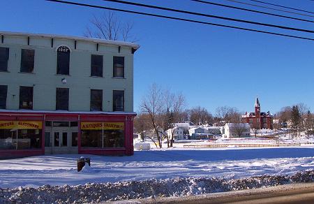 This picture taken from the Stetson Road looks from the Odd Fellows Hall across the now empty village area to the Stewart Library Building.
