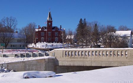 Here's the new bridge on Route 7 through town with the Stewart Library Building in the background.
