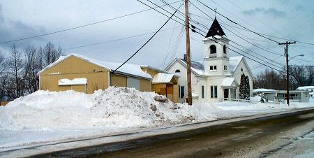 The storm left us with about a foot of new snow. Plows have made piles of snow like that pictured here near Building 14 and the Corinna Methodist Church on the Dexter Road. |