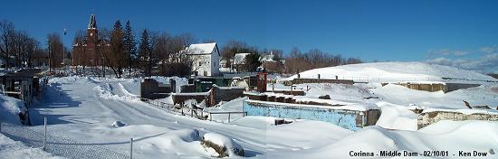 Click on this picture to view a larger copy. In this panorama of the former Eastland site, the left edge faces west. The right edge is roughly northwest. The pan is from West Main Street and the Steward Library Building around to the contaminated soil stockpile. The Middle Dam is in the center. |