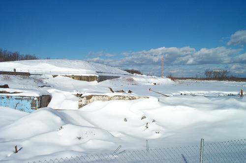 Once again, a blanket of snow covers a multitude of sins. This is the former Eastland Woolen Mill site viewed from Main Street looking back toward the contaminated soil stockpile. I try to imagine how this will look five years from now. |