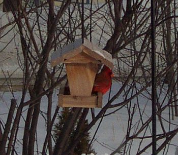This is not a great photo but I've wanted to get a picture of this male cardinal all winter. This is the best I've done so far. He visits our bird feeders daily but is very skittish. I have a great deal of respect for wildlife photographers. Making good pictures of animals is difficult and, for an amateur like me, seems to depend mostly on luck. |