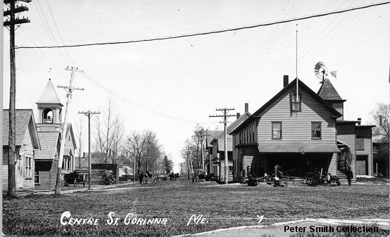 Here is another post card picture from Peter's collection. This view looks up the Dexter Road, then called Center Street, from Main Street. The Methodist Church can be seen on the left and Gray's store is on the right. I believe this picture was taken sometime before yesterday's photo. Notice the bank sign is not on John Gray's store. The bank branch was established in 1897, according to Sawtell. That would perhaps date this picture before then. |