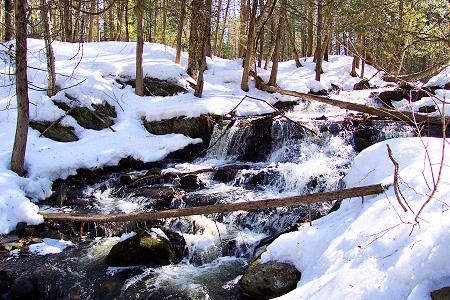 Here's a sure sign of Spring (SSOS). This picture of the Meadow Brook Falls on the Exeter Road was taken Saturday. There is still plenty of snow in the woods but recent warm weather is swelling local streams. |