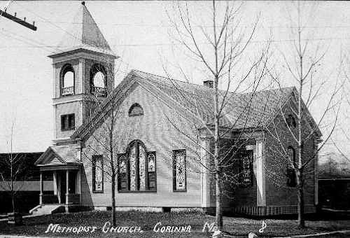 Phil Young sent in this photograph of the Corinna Methodist Church. It is from an old post card. According to 20th Century Corinna by William Sawtell (1984), the building was constructed in 1853 as the Union Church, so called, because several denominations united to build it. I believe this photo was taken after the building was remodeled in 1900. The interior of the building was again remodeled in 1944. The Church School Annex was added in 1961. |