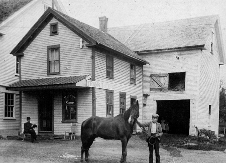 Yesterday Jason Paradis asked an interesting question in the Guest Book: Where was the town office located before the Stewart Library Building was constructed? I found the answer in "Corinna 175th Anniversary 1991" Edited by Everett E. Simpson, 1992. The picture above, published in that book courtesy of Bob And Arlene Pearson, shows Will Southard's livery stable on the Dexter Road. The building to the left is the Grange Hall. It used to be directly across from the Methodist Church. The livery stable was close to the current location of the Family Affair restaurant. The caption with this picture states that the town office was located upstairs before 1898. The boy holding the horse is identified as Frank Day, Jr. Will Southard is seated near the door. |