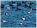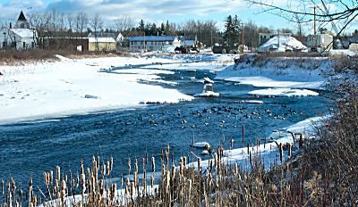 The photo above was taken from the Upper Dam looking downstream toward town. What looks like rocks partway down the stream are ducks gathered in the open water. While I stood watching, a few took off and flew close enough for a picture.