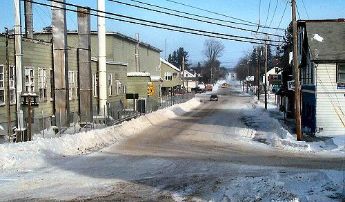 Continuing our look back, here is a picture taken January 17, 2000. At this point the mill demolition was in progress out back. However, on Main Street the only evidence was the barrier running along the front of the mill. |