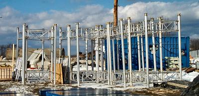 Near the location of the new bridge you will see this framework being assembled. This staging will support the bridge roadbed as it is framed up and poured across the span between the abutments. |