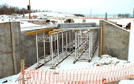 Work continues on the bridge. The framework is in place to support the road bed during construction.