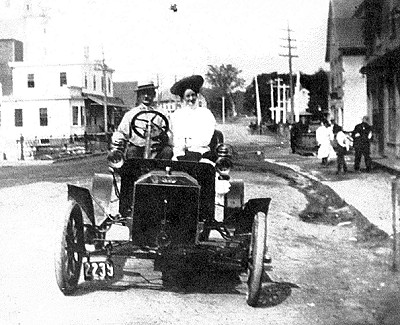 "Bing" Grindle sent me this picture of his mother, Elvira, and grandfather, Dr. Fred Redman riding in his automobile on Main Street in Corinna. The view is facing east. The picture was taken some time before September of 1911. The Ireland Brother's Grist Mill on the left in the background, burned at that time. See Bing's Guest Book entry for more about Dr. Redman. |