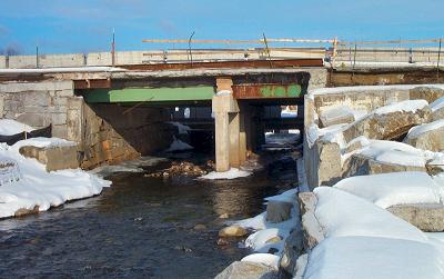 This is a view of the Main Street bridge taken from the south side. The Odd Fellows Hall used to sit in this location against the street. Next summer the bridge and the entire street will be permanently removed to allow excavation of the contaminated soil below. |