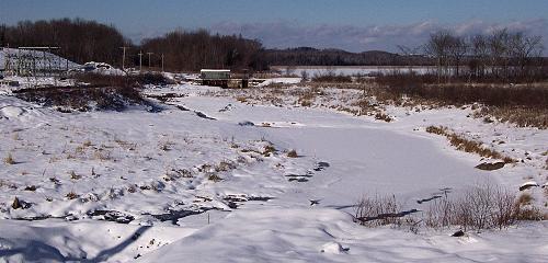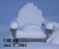 This area used to be the mill pond, between the Upper Dam (visible in the distance) and the Middle Dam near the mill. With the removal of the Middle Dam, it has been restored to a free running stream. Spring will bring the first run-off season on this newly reconstructed wetland area. As you can see from the Weather Chair below, we got about 5 inches of new snow last night. |
