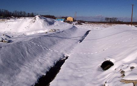 Viewed from the Route 7 bridge, this is the newest portion of the river bed, the section from the former mill pond across the old mill location to the bridge. While it is not complete, the finishing touches will be added next summer, it is ready for spring run-off. |