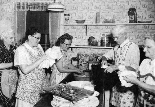 In the Kitchen of the Twilight Grange, 1955 Pictured are, left to right, Reba Tuttle, Joyce Hatch, Alma Pomroy, Eugene Cooley, Zelda Emerson If you know more about this location or related events. Please consider sharing your stories on the Guest Book. Picture from Corinna 175th Anniversary 1991 edited by Everett Simpson, published by The Town of Corinna, courtesy of the Jerome and Hazel Emerson. |