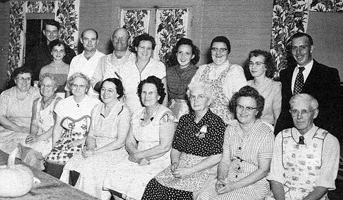 Twilight Grange-Supper Crew, November 1955 Seated, L to R: Yvonnne Cooley, Ruth Bemis, Zelda Emerson, Myrtice "Mike" Crosman, Mabel Bird, Reba Tuttle, Alma Pomroy, Eugene Cooley. Standing, L to R: Everett Rankin, Jr., Claudine Rankin, Roland Pomroy, Raynor "Razor" Crosman, Avis Foss, Muriel Malone, Joyce Hatch, Arlene Pearson, Clifton Worthen. I guess this picture was taken the same evening as yesterday's photo because Mr. Cooley is wearing the same apron. If you know more about this location or related events. Please consider sharing your stories on the Guest Book. Picture from Corinna 175th Anniversary 1991 edited by Everett Simpson, published by The Town of Corinna, courtesy of the Jerome and Hazel Emerson. |
