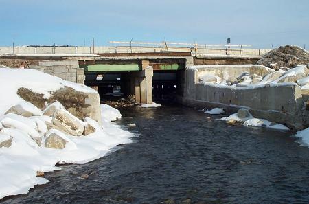 Two years ago in January of 2001, old Main Street was still in place and the river ran in the old bed. Here is the bridge under the street as we had never seen it before. The Odd Fellows Hall had been moved and the other buildings demolished. |