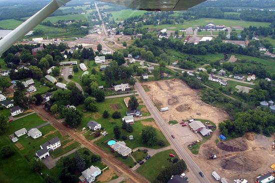 Here's an aerial showing how Route 7 comes into Corinna from Newport, at the lower right and, after making a little hook in the village area, heads straight out of town toward Dexter. Following the road into town, the piles of dirt in the lower right are used for the sewer work now going on in town. Notice then the Two Knights Restaurant followed by a large lot presently under development. I have heard that a car wash will be built there. Ireland Avenue, on the left, is unpaved just now. The surface was removed for the sewer work. The village area, the Superfund cleanup site, is the open space near the top-center of the picture. |