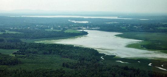 This aerial photo was taken on a hazy day. However, it is an interesting view of the watershed. In the foreground is Corundel Lake in Corinna. The winding river-like waterway at the lower right is the inlet of the East Branch of the Sebasticook River. Corinna village is at the further end of the lake. Beyond it, in the center is the open area where the river widens about half way to the lake. The large body of water along the top of the picture is Sebasticook Lake in Newport. It is three or four miles from Corinna village to Sebasticook Lake. |