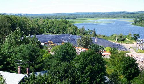 From the bell tower of the Stewart Library Building, this is the view looking north toward Corundel Lake. In the foreground are the trees on the Saint Albans Road (Pleasant Street). Behind them we can see the contaminated soil stock pile. It covers about a acre and holds the 75,000 cubic yards of soil removed from the cleanup site. The excavation equipment visible near the left side of the pile will load the soil into trucks for transport to the decontamination facility not far out of site to the right. |