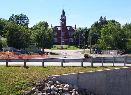 From across the river, the new connector road draws your eye up to the Stewart Library Building.