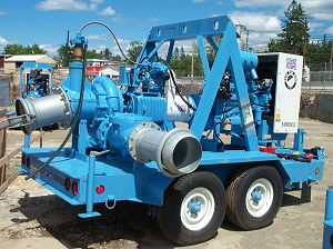This is one of two large pumps that will be used to divert the river until the new channel is built. The water will be pumped from just above the middle dam. Pipes will carry water past the sections of the stream bed that must be excavated under the Odd Fellows Hall and near the trestle. |