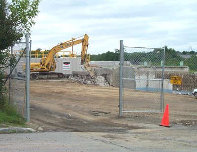 This opening in the fence is at the driveway that used to go back in behind the mill from Main Street, just beside Winchester Park. This cellar section has been the first part excavated. Now you can see it is being filled in. The narrow driveway has been widened into a haul road. It will be used for access to the soil stockpile area out back. If you haven't already, scroll down and check out the Weston Update for July 14, 2000. It has good information on progress and projected work for the next two weeks. |