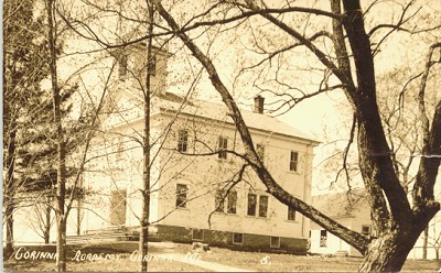 This is a picture from Peter Smith's post card collection. The card is postmarked December 9, 1913. The picture was taken from Pleasant Street (St. Albans Road). Built before the Civil War in 1851 with money raised by local residents, Corinna Union Academy was incorporated by the State Legislature in 1852. The wings, which now extend either side of the building, were completed in 1932. Notice the belfry on the building. It originally housed the bell that was recently returned to the building after many years absence.