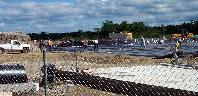 A picture from June 17 showed the square bordered in concrete blocks that was built out back. Now they are lining it with black plastic. It must be the base for the soil treatment plant. The contamination will be removed from thousands of cubic yards of excavated soil before it is put back in place. |