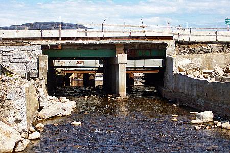 This picture of the existing bridge over the East Branch was taken just downstream from Main Street. The Odd Fellows Hall used to sit on this location over the river. At some point this summer, this bridge and the existing Main Street will be permanently removed. The present schedule calls for the new road and bridge to be open for traffic in July. |
