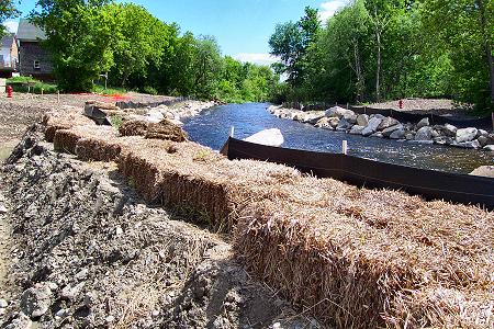 This is the lower end of the new river channel where it meets the present river bed. The earth dike on the left, topped with hay bales, separates the new channel from the present river. |